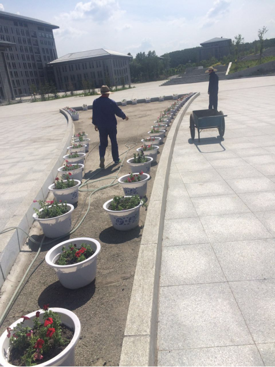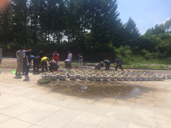 在后勤管理处处长赵明同志、资产处处长王明轩同志、扶贫办主任付德才同志、南满铁路博物馆主任李宪隆同志的带领下,后勤党总支全体党员及预备党员同志不畏脏累、不畏酷暑,在商务中心西侧进行花盆装土、花卉栽种,并用手推车将种植好的盆花摆放到景观桥造型带处,共计栽种摆放盆花100余盆,为学院景观桥增添了一道靓丽的风景。