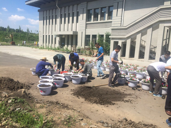 2017年6月23日下午1点30分,后勤党总支开展党员义务劳动,向七一献礼,为景观桥绿化造型摆放盆花。