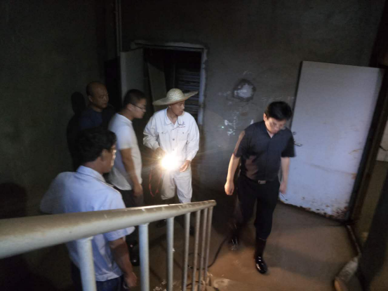 在商务中心地下泵房仍有大量积水,照明缺失的恶劣环境下,田雷副院长同基建科所有同志深入现场,对商务中心地下消防、供热、生活水、配电室的损坏情况进行查勘与统计,之后又对商务中心室外排水方案进行论证。