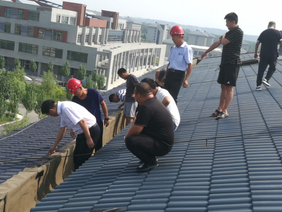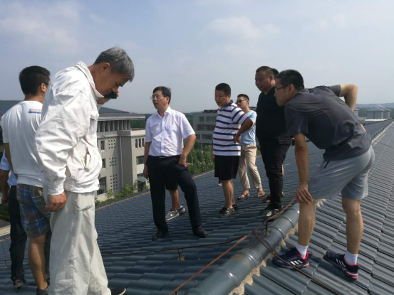 首先,一行人员来到3#实训楼屋顶。田雷副院长对屋面防护措施、檐口瓦的铺装工艺、防水卷材铺装方案进行检查,并提出天沟立面卷材上返屋面部分应用钢带打牢,下返檐口部分应用燕尾自攻钉固定,以免风载过大,引起卷材脱落;外墙墙面砖空鼓处要一并处理好,将安全隐患降至最低。之后,大家来到博物馆标段现场,田雷副院长对该标段的安全文明施工,成品保护,工期提出要求。他强调,在保证质量的前提下,要确保工期,务必在合同要求工期内完工,以保证新学期开学及70周年校庆正常开馆。随后,大家来到火车头文化广场现场,田雷副院长对关键工序提出具体要求,他指出,火车头的除锈、涂装必须要保证质量,确保效果。