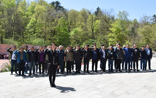 在杨靖宇将军雕像前,同志们重温了入党誓词,使每一位同志都接受了一次心灵的洗礼。接着,全体党员怀着无比崇敬的心情向英雄的杨靖宇将军三鞠躬。